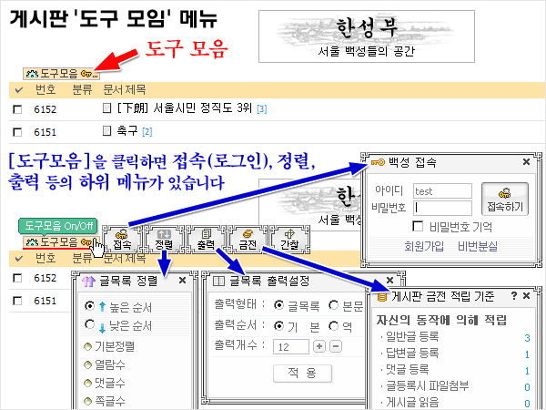 ![]() °Ô½ÃÆÇ »ó´Ü¿¡ 'µµ±¸¸ðÀ½' ¸Þ´º°¡ ÀÖ½À´Ï´Ù. Ŭ¸¯Çϸé Á¢¼Ó, ºÐ·ù, Á¤·Ä, Ãâ·Â, ±ÝÀü µîÀÇ ¸Þ´º°¡ ³ª¿É´Ï´Ù. Á¢¼Ó : ·Î±×ÀÎ ¹× ·Î±×ÀÎ ÈÄ µî·ÏÁ¤º¸ È®ÀÎ, ·Î±×¾Æ¿ô ºÐ·ù : ¹®¼ ºÐ·ù(Ä«Å×°í¸®)°¡ ÀÖÀ» °æ¿ì ºÐ·ùº° Ãâ·Â Á¤·Ä : ¿¶÷¼ö, ´ñ±Û¼ö, µî·ÏÀÏ, Á¦¸ñ µîÀÇ ¼ø¼·Î Ãâ·Â Ãâ·Â : ÇÑ È¸é¿¡ Ãâ·ÂµÉ ¹®¼ÀÇ ¼ýÀÚ(±Ô¸ð)¿Í Ãâ·Â Çü½Ä ±ÝÀü : °¢ °Ô½ÃÆÇº° ±ÝÀü Àû¸³ ±âÁØ °£Âû : ·Î±×ÀÎ ÈÄ °£Âû(ÂÊÁö) ³»¿ª Ç¥½Ã óÀ½(¸ÞÀÎ) ȸéÀÌ ¾Æ´Ñ °÷¿¡¼µµ ·Î±×ÀÎ, ·Î±×¾Æ¿ô, ÂÊÁö È®ÀÎ µîÀ» ÇÒ ¼ö ÀÖÀ¸¸ç, °¢ °Ô½ÃÆÇº°·Î °Ô½Ã¹°À» ÀÚÀ¯·Ó°Ô Ãâ·Â½Ãų ¼ö ÀÖ½À´Ï´Ù. - »çÀ̹ö Á¶¼±¿ÕÁ¶ |